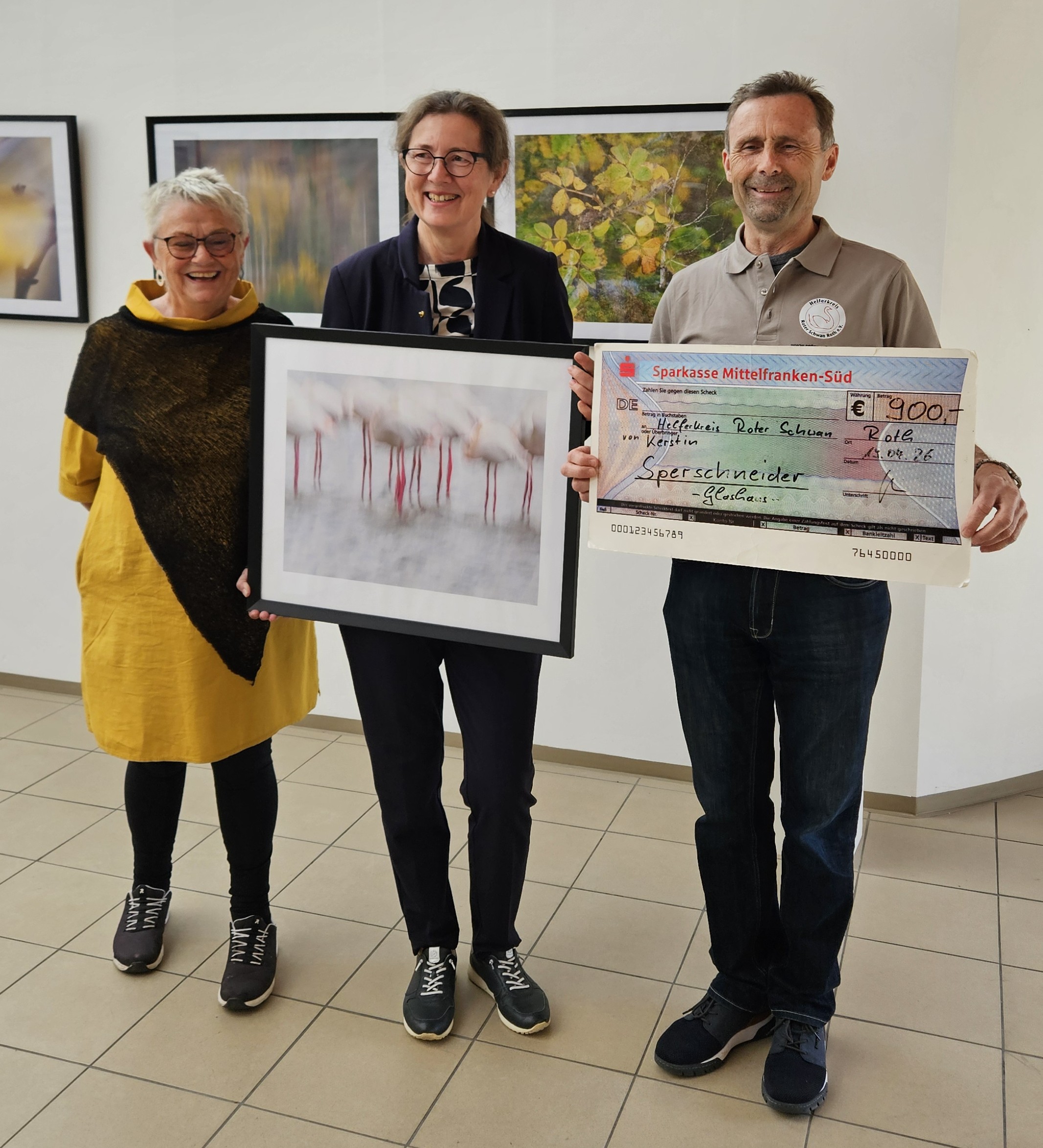 Frau Dr. Kerstin Sperschneider zeigt das Gewinnerbild, Frau Roswitha Madlon Hoelle und Werner Forster freuen sich über die gelungene Aktion und über die Spende
